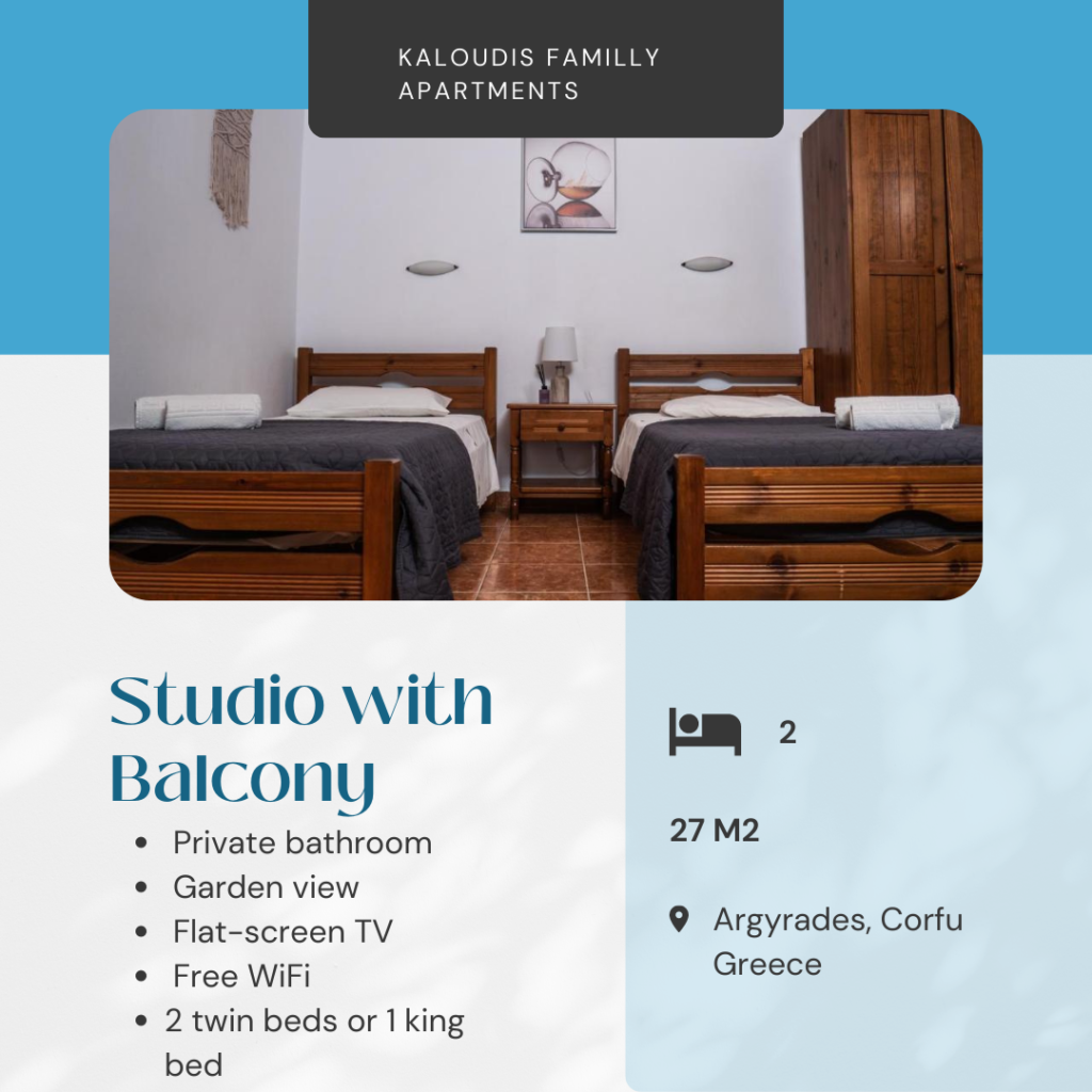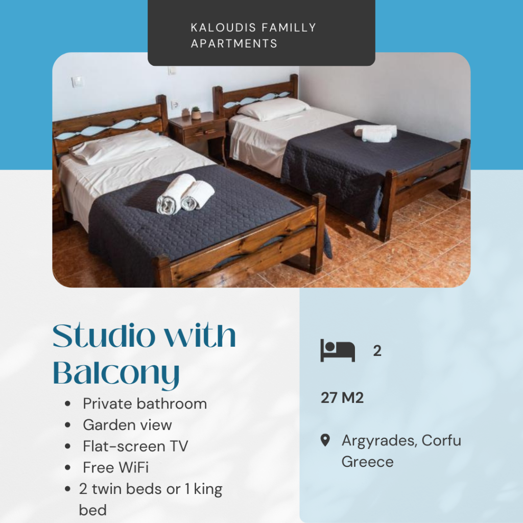 The studios are located near the beach. They are cozy with lots of natural lighting on the first floor. The studios are a 5 minute walk from the beach and conveniently located near restaurants, supermarkets cafes and pharmacies. The studios provide a fully equipped kitchen (including oven and refrigerator) ,a bathroom including shower cabin and one relaxing and cozy bedroom equipped with TV and internet access.